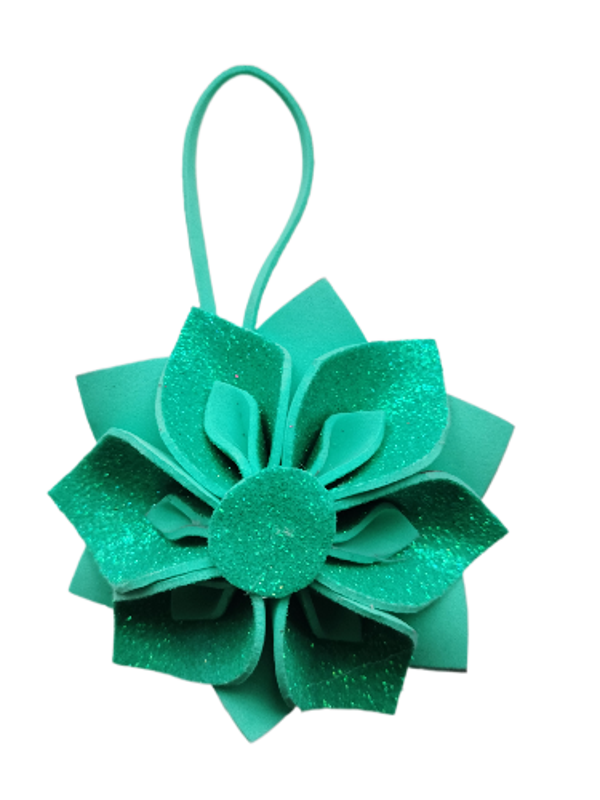 Ta wyjątkowa bombka w formie przestrzennego kwiatka została wykonana ręcznie z dekoracyjnej pianki z brokatem. Zestawienie matowej i brokatowej pianki w dwóch tonacjach tego samego koloru tworzy elegancki i spójny efekt, który pięknie prezentuje się w świątecznym oświetleniu.